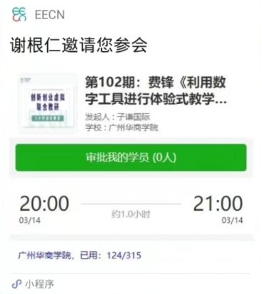 为进一步落实学校创新创业教育改革相关政策,依据本科教学评估指标要求,进一步探索专创融合教学改革路径,我院(中心)联合中国创业教育工作者网络(EECN),在本学年每周为学校不同专业教师安排一次专创融合教学培训活动,培训采用在线虚拟教研室的形式开展,培训时间为每周四晚8点(偶尔有调整)。希望各位老师积极报名参加,并在培训活动后发送一张观看讲座视频的照片、一张讲座界面截图到邮箱xiegenren@163.com。