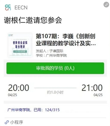 为进一步落实学校创新创业教育改革相关政策,依据本科教学评估指标要求,进一步探索专创融合教学改革路径,我院(中心)联合中国创业教育工作者网络(EECN),在本学年每周为学校不同专业教师安排一次专创融合教学培训活动,培训采用在线虚拟教研室的形式开展,培训时间为每周四晚20点(偶尔有调整)。希望各位老师积极报名参加,并在培训活动后发送一张观看讲座视频的照片、一张讲座界面截图到邮箱xiegenren@163.com。