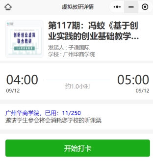 为进一步落实学校创新创业教育改革相关政策,依据本科教学评估指标要求,进一步探索专创融合教学改革路径,我院(中心)联合中国创业教育工作者网络(EECN),在本学年每周为学校不同专业教师安排一次专创融合教学培训活动,培训采用在线虚拟教研室的形式开展,培训时间为每周四晚20:00-21:00。希望各位老师积极报名参加,并在培训活动后发送一张观看讲座视频的照片、一张讲座界面截图到邮箱xiegenren@163.com。
