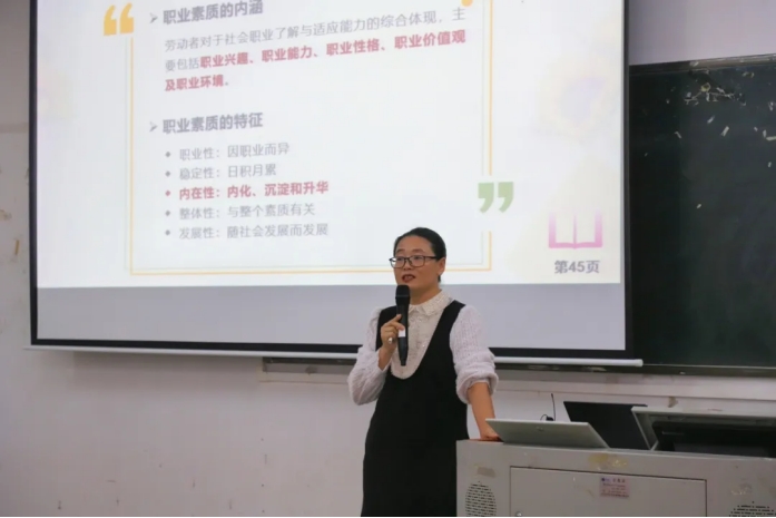 紧接着,高艳锋老师深入讲解了职业素质的培养。她详细阐述了职业素质的内涵,涵盖了职业兴趣、职业能力、职业性格、职业价值观以及职业环境等核心要素,探讨了职业素质的特征,包括其职业性、稳定性、内在性、整体性以及发展性。此外,她还详细介绍了职业素质的构成要素,为学生们提供了一个全面的职业素质培养框架。