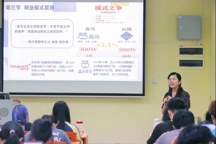 胡老师带领学生进一步探讨了主流商业模式类型及其适用场景。她特别指出,商业模式创新需结合行业特性与企业资源,例如盒马鲜生借鉴山姆会员店模式,却通过“线上线下一体化”实现差异化突围,正是“借鉴提升法”的典范。她强调,创业者需从行业痛点出发,灵活组合模式要素,而非简单复制成功案例。