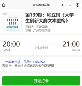 为进一步落实学校创新创业教育改革相关政策,依据本科教学评估指标要求,进一步探索专创融合教学改革路径,我院(中心)联合中国创业教育工作者网络(EECN),在本学年每周为学校不同专业教师安排一次专创融合教学培训活动,培训采用在线虚拟教研室的形式开展,培训时间为每周四晚20:00-21:00。希望各位老师积极报名参加,并在培训活动后发送一张观看讲座视频的照片、一张讲座界面截图到邮箱xiegenren@163.com。