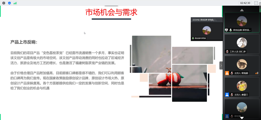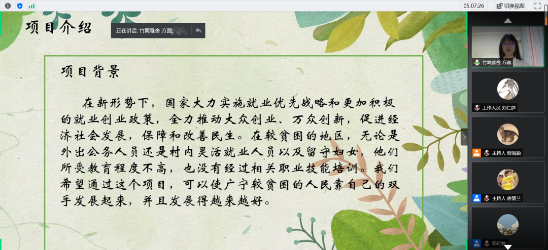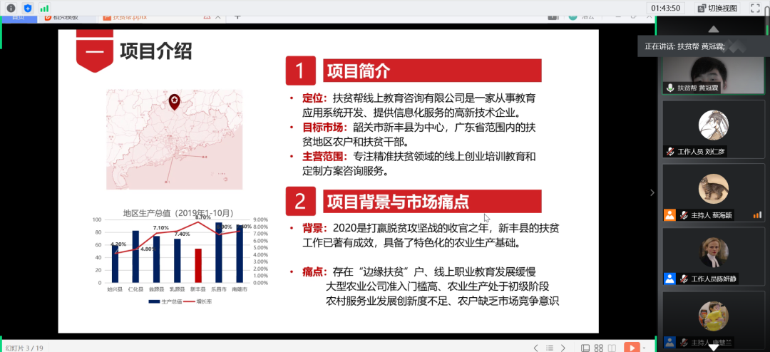 本次入围决赛的20支队伍参赛项目内容丰富,类型多样,涉及“互联网+”信息技术服务、社会服务、文化创意服务等多个领域。经过近六个小时的激烈角逐,“原创品牌建设与互联网平台运营-广东特色礼物变色茶宠”、“未来已来校园MCN”、“竹篱雅舍,云育凤栖”等项目团队赢得了专家评委的一致肯定。