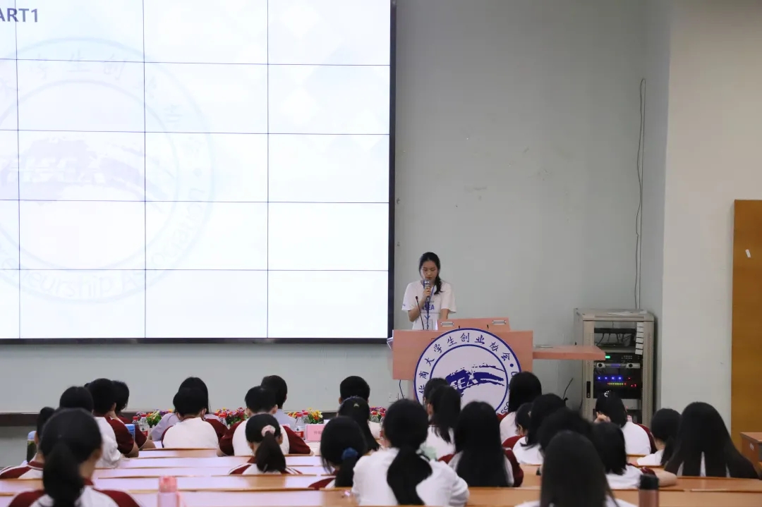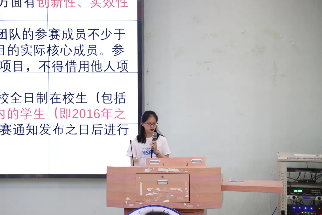 宣讲会上,蔡海颖和张梓妍同学从大赛目的及要求、商业计划书、项目路演、现场答辩、大赛奖项这五个方面详细介绍了“互联网+”大赛。同时她们还阐述我校开展的两条赛道:高教主赛道和青年红色筑梦之旅,以及科普大赛相关奖项和国家对于大学生创业的鼓励政策。