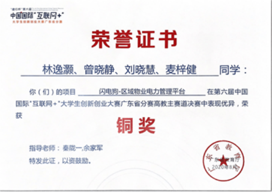 第六届中国国际“互联网+”大学生创新创业大赛广东省分赛决赛于2020年8月9日在华南理工大学(大学城校区)举行。在省决赛中,我校参赛项目《闪电狗—区域物业电力管理平台》与来自其他154所学校的1549支队伍展开激烈角逐,经过10分钟的路演和5分钟的答辩,最终,取得铜奖的佳绩。
