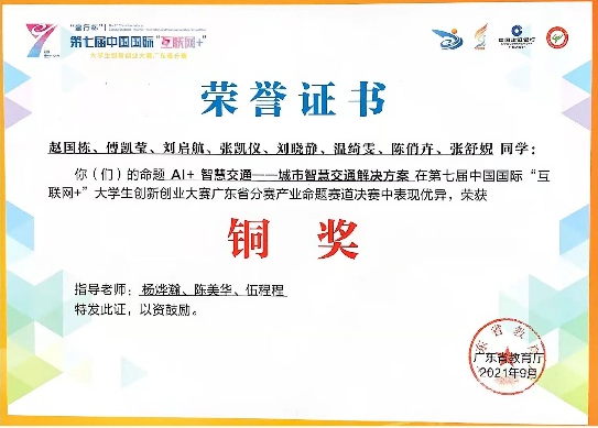 赵国栋等参赛成员以“AI+智慧交通——城市智慧交通解决方案”为命题,凭借项目《基于大数据——Al 智慧出行交通信息平台》,在第七届中国国际“互联网+”大学生创新创业大赛广东省分赛产业命题赛道决赛中,经过激烈角逐,最终荣获铜奖。