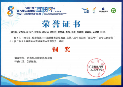 广州华商学院《稚影传媒——融媒体世界领跑者》项目在第八届中国国际“互联网+”大学生创新创业大赛中表现不凡,最终冲出重围获得省赛铜奖。