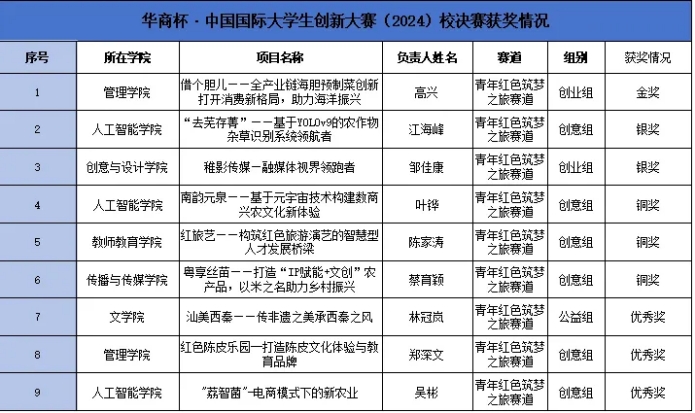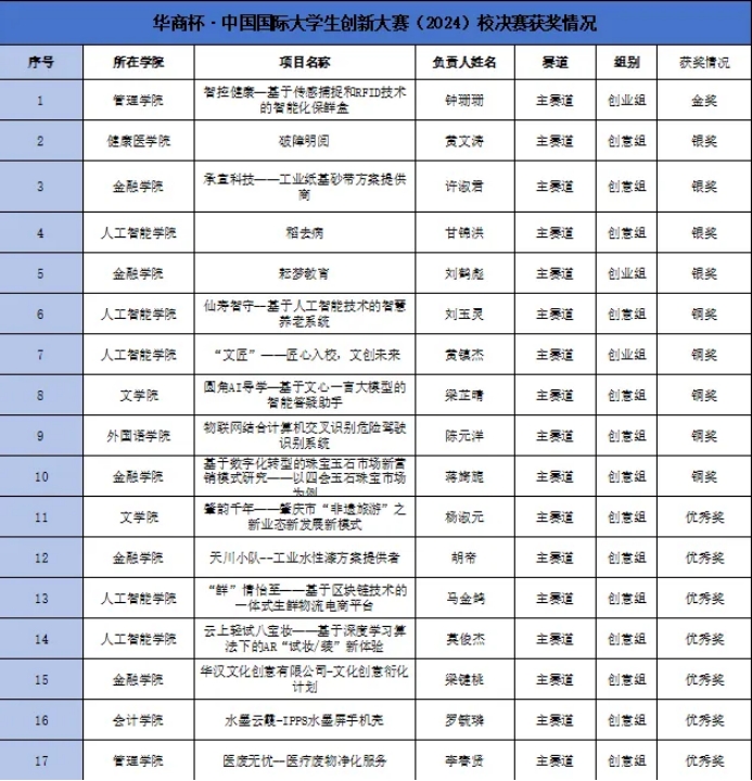 根据专家评委的评审结果,中国国际大学生创新大赛校决赛获奖情况如下: