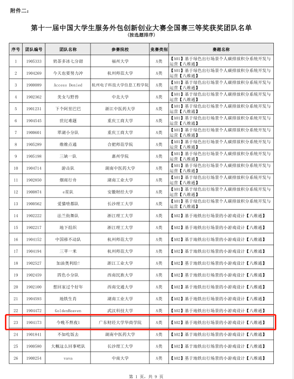 近日,第十一届中国大学生服务外包创新创业大赛组委会公布全国赛决赛晋级及三等奖获奖名单公告,我校有两支队伍再创佳绩,“快乐就完事”成功晋级全国总决赛角逐一、二等奖, “今晚不熬夜1”队获得全国赛三等奖。