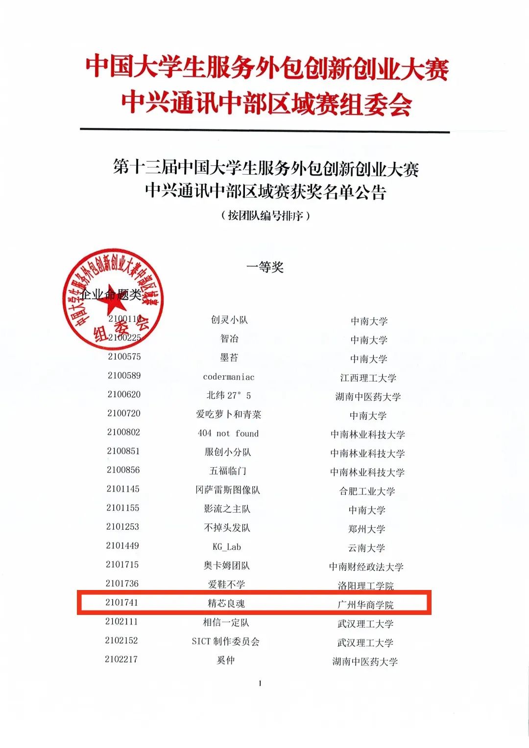 中兴通讯中部区域赛组委会公布获奖名单