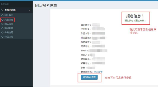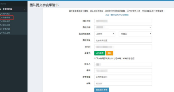 1.点击“完善信息”填写团队信息并上传承诺书, 团队信息审核状态也在该页面查看,如下图示: