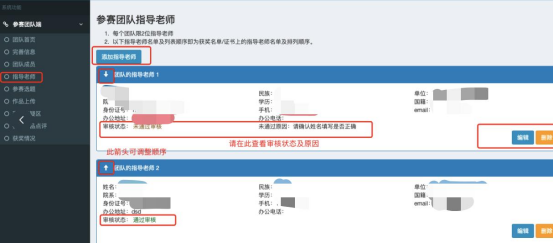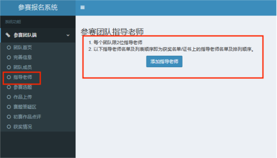 3.点击“指导老师”,添加指导老师信息,并可在该页面查看审核状态,如下图示: