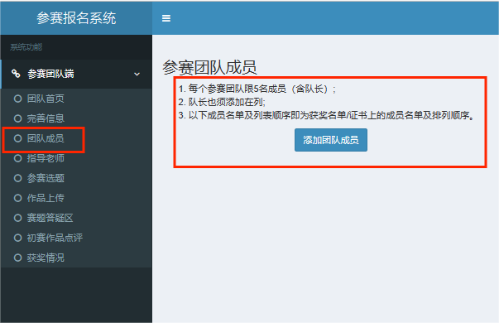 (2)团队在此添加的成员顺序即为获奖后获奖名单/证书上的顺序(在提交作品前有一次调整机会,时间见参赛手册);