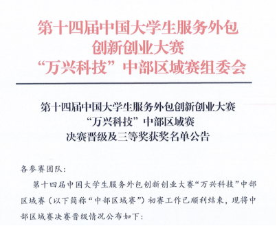 5月16日,中国大学生服务外包创新创业大赛中部区域赛组委会公布了第十四届中国大学生服务外包创新创业大赛“万兴科技”中部区域赛决赛晋级及三等奖获奖名单。