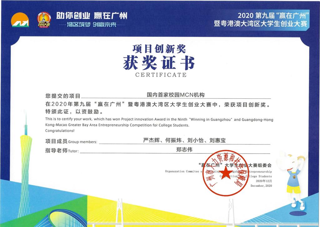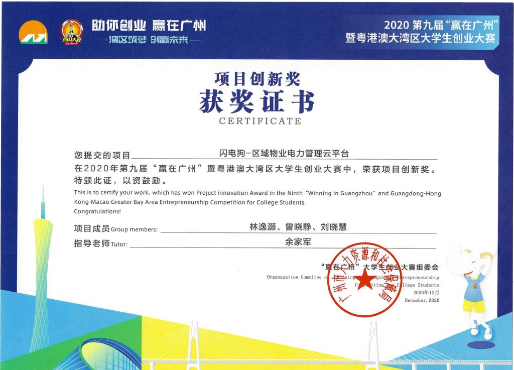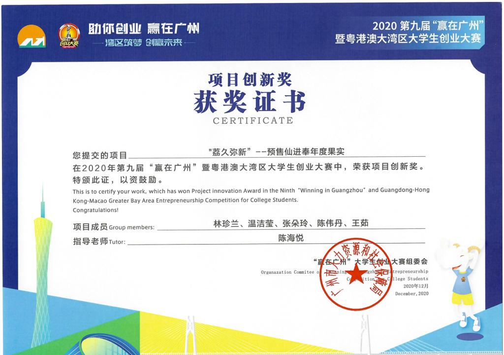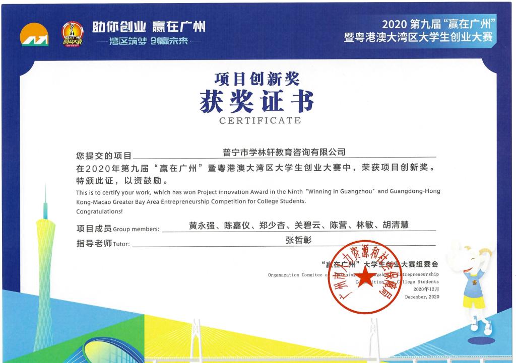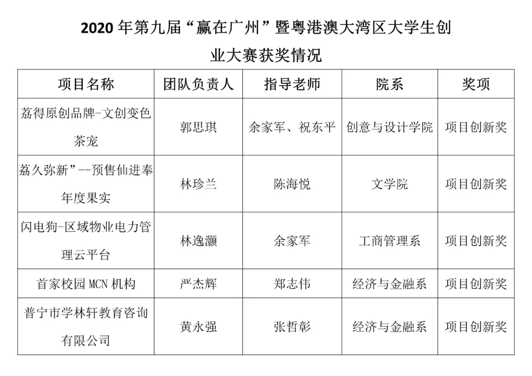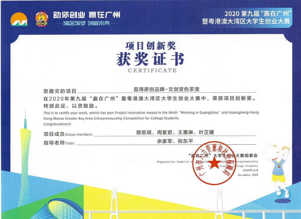 由广州市人力资源和社会保障局主办,中国南方人才市场管理委员会办公室承办的2020年第九届“赢在广州”暨粤港澳大湾区大学生创业大赛中,华商学院《荔得原创品牌-文创变色茶宠》、《"荔久弥新”--预售仙进奉年度果实》、《闪电狗-区域物业电力管理云平台》、《首家校园MCN机构》、《普宁市学林轩教育咨询有限公司》5个项目均荣获“项目创新奖”。