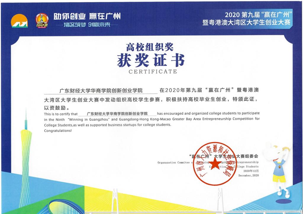 同时,鉴于创新创业学院在本次大赛组织过程中的优异表现,广东财经大学华商学院创新创业学院获得 “高校组织奖”荣誉。