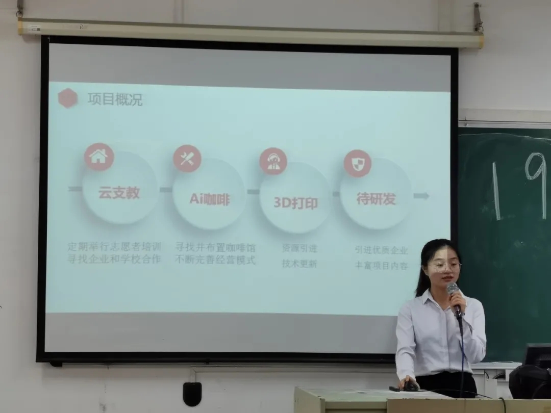 该项目分为云支教、AI咖啡、3D打印的三大主要板块以及其它待研发的版块。目前主要运营云支教,3D打印和AI咖啡所赚取的利润是云支教的资金来源。