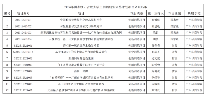 根据《教育部高等教育司关于公布 2023 年国家级大学生创新训练计划项目和重点支持领域项目名单的通知》( 教高司函[2023]8号)和《广东省教育厅关于公布2023年大学生创新创业项目立项和结题验收结果的通知》(粤教高函〔2023〕30号),我校共有12个项目获得2023年国家级、省级大学生创新创业训练计划项目立项,其中国家级大学生创新创业训练计划项目4项,省级大学生创新创业训练计划项目8项。