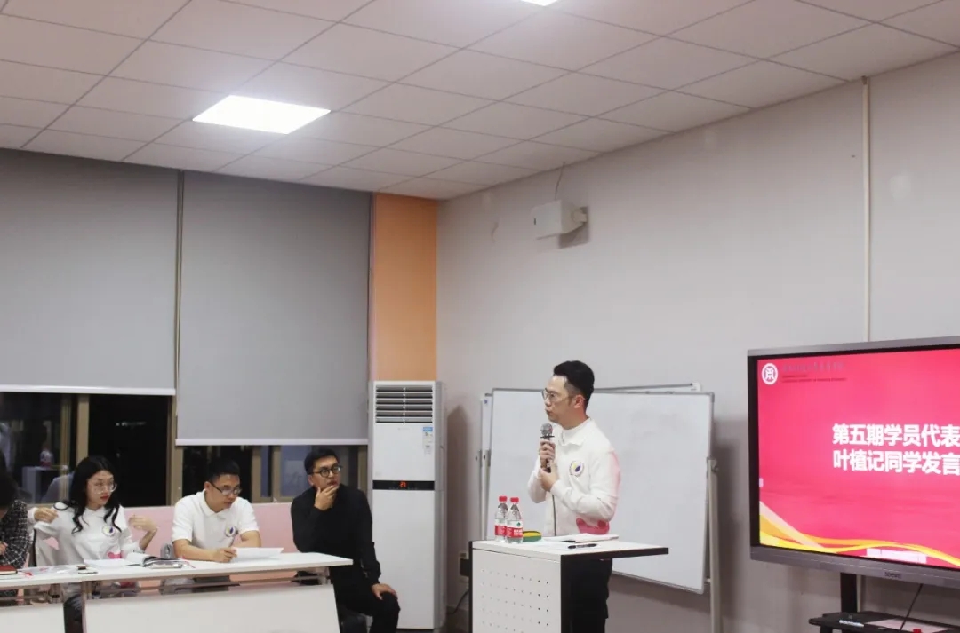 第五期学员代表叶植记同学上台发言。他在发言中分享了自己个人公司实习经历及初期创业的经历。对此,他总结出实践带给他的不仅仅是对专业知识的考验,更是一种经验积累,通过结合自身的情况作出对应策略来逐步完善企业体系。最后,叶同学讲述了自己在开办企业过程中所受到的启发并分析现存的不足,提出对往后课程的期望。