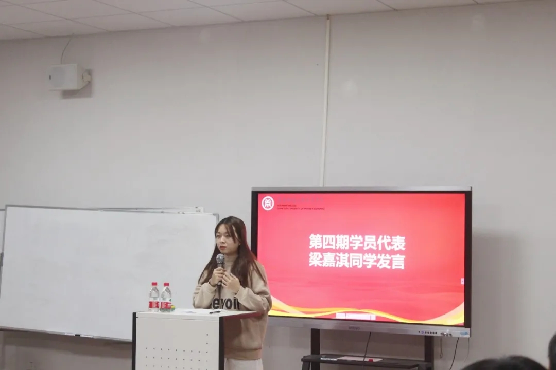梁嘉琪同学在发言中表示参加第四期SYB课程培训对她来说是一次非常难忘的经历,她从中不仅学习到了创业知识,还收获到了友谊。此外,梁嘉琪同学还分享到,自己在加入SYB创业培训班前内心一直都有创业的想法,相信来到SYB班的同学也一样有创业想法或者已经正在行动中,她鼓励同学们勇敢将想法投入实践,迈出第一步,在不断的实践中逐步完善企业构思。发言的最后,梁嘉琪告诉同学们对于本期课程不必压力过大,并给予同学们学习上的一些提示。