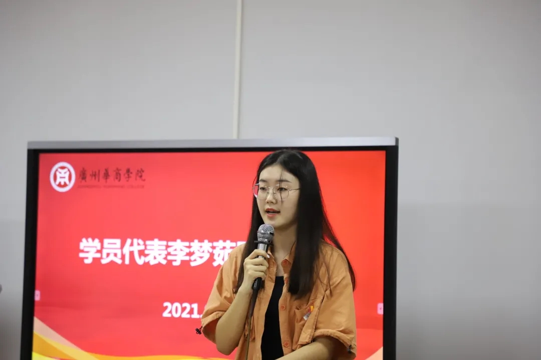 学员代表李梦茹同学在开班仪式上发言。她介绍了自己参加SYB创业培训班的目的,以及自己需要提升创业知识技能的强烈愿望,并表示一定认真学习,取得优秀成绩,不辜负学校领导、老师们的期望。
