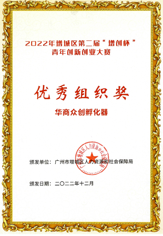 2022年增城区第二届“增创怀”青年创新创业大赛优秀组织奖(华商众创孵化基地)