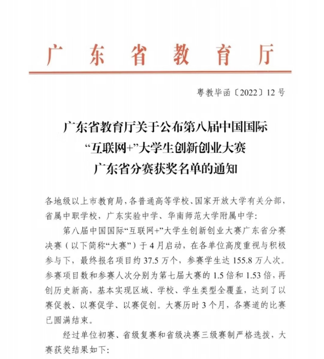 近日,第八届中国国际“互联网+”大学生创新创业大赛广东省分赛(粤教毕函【2022】12号)获奖名单公布,我校《稚影传媒—融媒体世界领跑者》和《中健领航--多维度智慧校园综合解决方案》两个项目获省赛铜奖