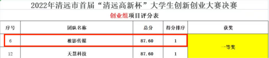 为深入贯彻落实习近平总书记对技能人才工作重要指示批示精神和省委、省政府实施高质量发展战略的部署安排,为高校大学生搭建创新创业展示交流、资源对接和项目孵化平台,3月9日,我与高新共成长——清远市首届“清远高新杯”大学生创新创业大赛总决赛在清远高新区天安智谷举行。我校学生团队稚影传媒以优异的成绩获得创业组一等奖。
