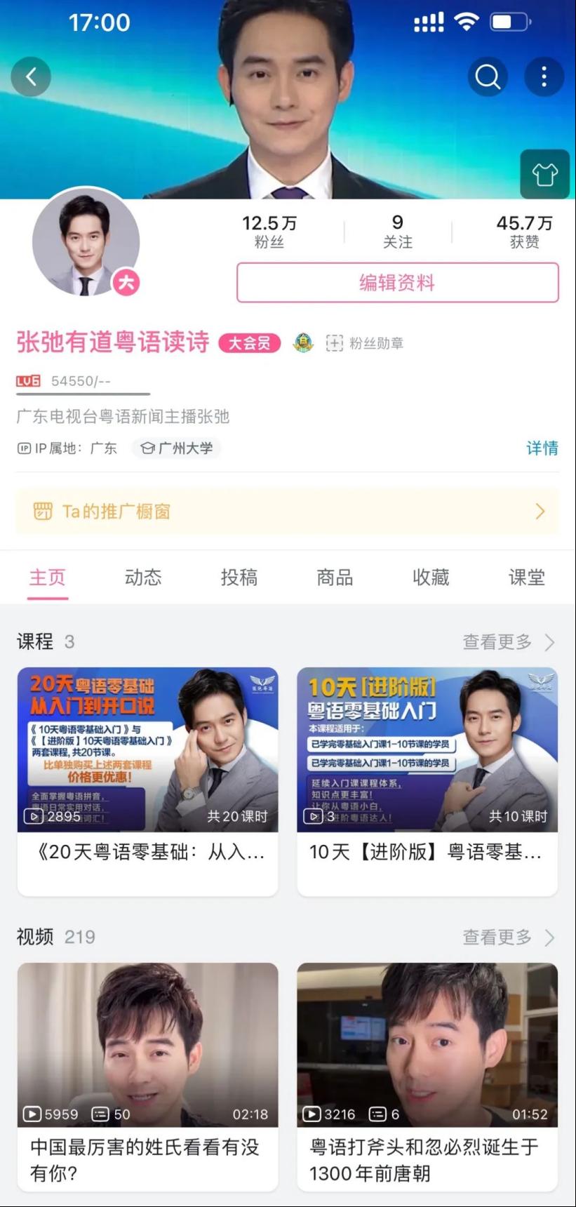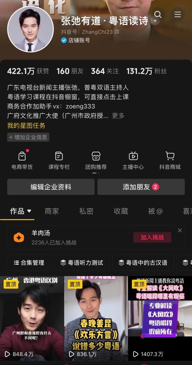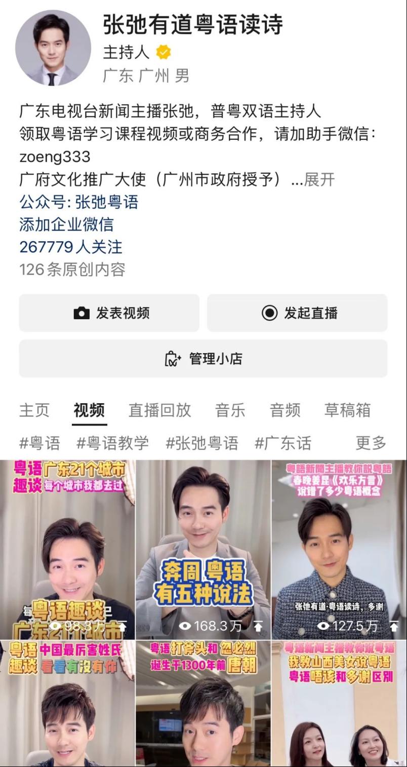张弛老师是广东知名粤语新闻主播,在日常生活中热爱阅读古诗词和历史文化书籍,擅长通过创新的方式去推广古诗词和粤语文化。他利用自身的新闻传播专业优势,自创了“张弛有道·粤语读诗”账号。视频内容大多使用创新的形式来解读古诗词,用接地气的表达传播粤语文化。他将视频发布在各个平台上,获得了许多网友的关注和点赞。目前他已经在抖音、B站、微信视频号上拥有超过170万粉丝。